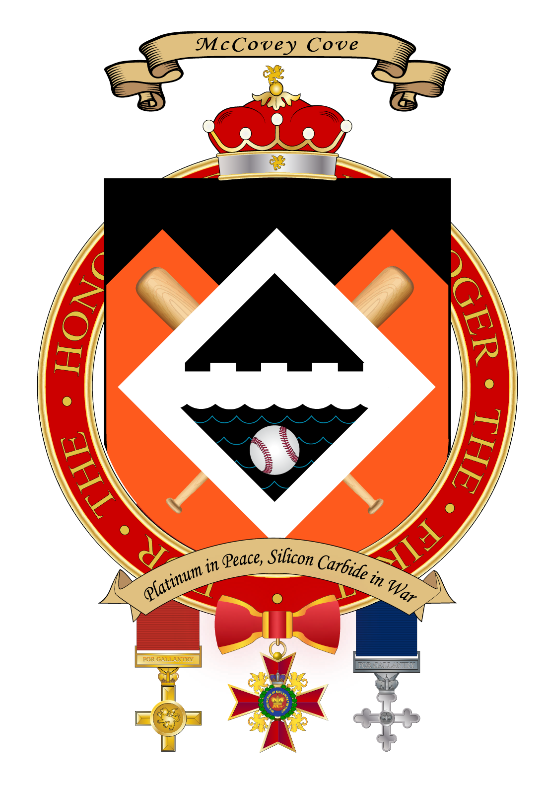 The Earl and Countess of McCovey Cove are lifelong aficionados of the Grayson-famous game of Baseball; their combined love of the game formed the basis of their early friendship that grew romantically. The colors Tenne, Sable, and Argent are used to represent the team colors of the baseball team, the San Francisco Giants. The symbolism of the two points in Tenne represent the Twin Peaks of San Francisco, which are visible from Oracle Park, while the top of the white lozenge represents Mount Sutro. Mount Sutro also holds the towers for all major broadcast centers in the city, and is a nod to the Countess' work in broadcasting. The white lozenge represents a baseball diamond, and the crossed bats the tools of the game. The embattlement within and the engrailed lines represent the waters of McCovey Cove beyond the county's wall, while the charge of the baseball proper is representative of the home runs hit over the wall and into the cove waters.